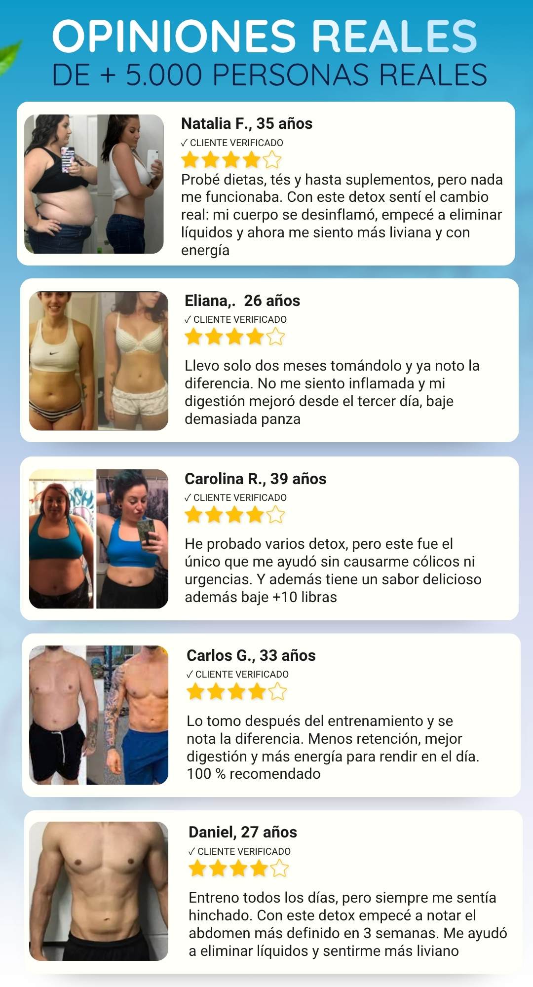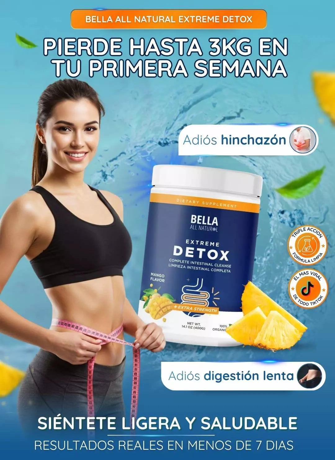 Apoya la pérdida de medidas de forma natural al eliminar toxinas, mejorar la digestión y reducir la retención de líquidos. No es un quemador de grasa, pero sí favorece un cuerpo más ligero.